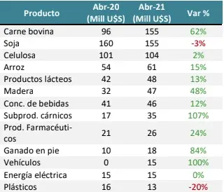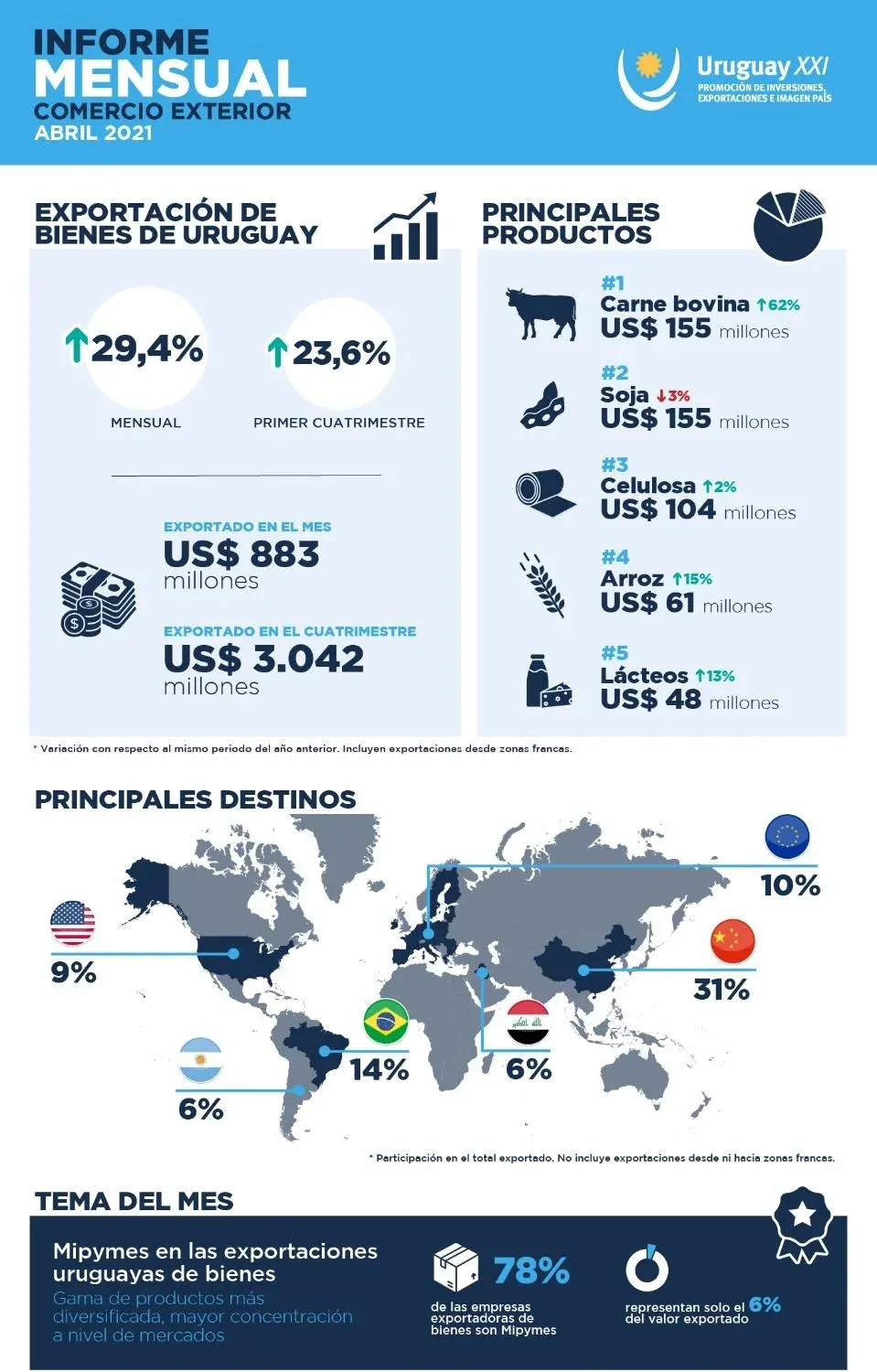 La suba del último mes se debió principalmente a mayores exportaciones de carne bovina, subproductos cárnicos, madera, autopartes, ganado en pie, arroz y lanas y tejidos, informó Uruguay XXI. Cabe recordar que durante abril del año pasado el comercio exterior de Uruguay sufrió una contracción del 23% por los efectos de la pandemia. Sin embargo, desde el último trimestre de 2020 se viene consolidando una sostenida recuperación.