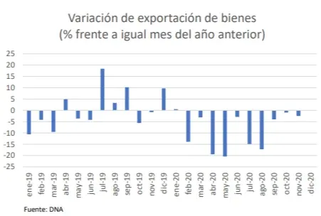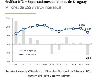 Pese a que se habían recuperado sobre el último trimestre, la fuerte contracción que registraron las exportaciones de bienes uruguayas por los efectos de la pandemia durante buena parte del año llevó a que las ventas totales cayeran 12,5% en 2020, a US$ 8.076 millones, incluyendo las ventas desde zonas francas. En 2019, las exportaciones de bienes habían cerrado con un flaco crecimiento de 0,7%.