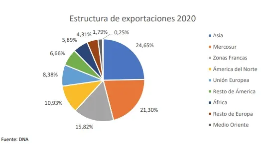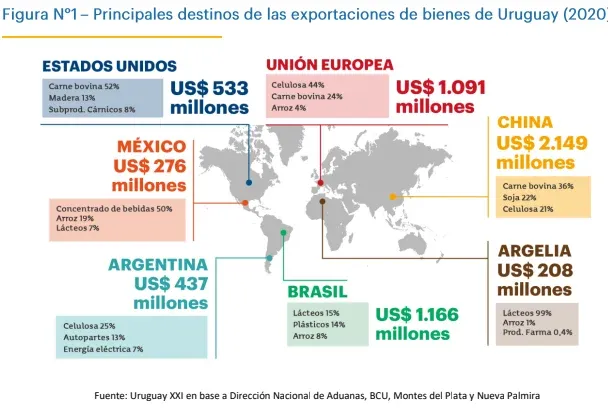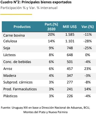 "De esta forma, la variación de las exportaciones uruguayas de bienes estuvo en línea con las exportaciones de la región y el mundo, en un año marcado por la pandemia del covid-19 que produjo una retracción generalizada de las economías y el peor desempeño del comercio internacional desde la crisis internacional de 2008", dice el informe de Uruguay XXI.