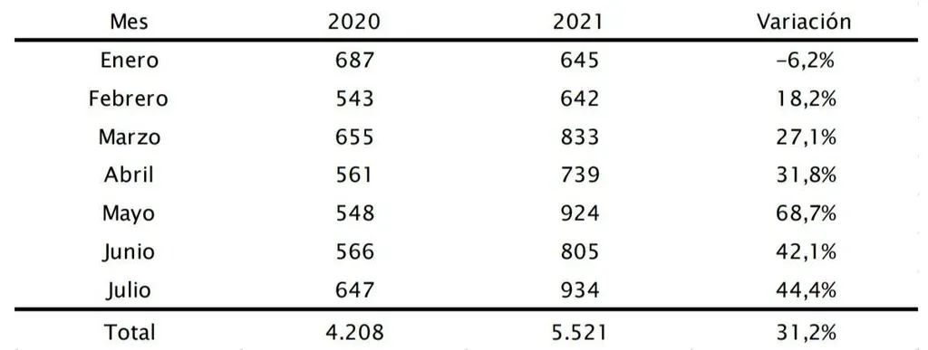 Considerando la información acumulada a julio, las compras al exterior se situaron en US$ 5.521 millones, incrementándose 31,2% respecto a igual período de 2020. Al descontar las adquisiciones de petróleo, las importaciones crecieron 31% en la comparación interanual.