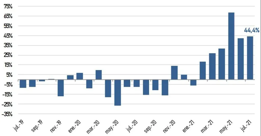 Si se considera el acumulado del año, las exportaciones de bienes industriales aumentaron 40% en comparación con enero-julio de 2020 y 14,7% en comparación con mismo período de 2019.