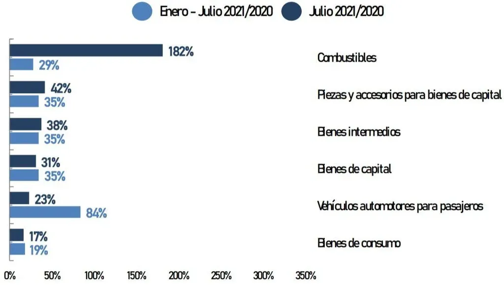 Por otro lado, analizando las adquisiciones externas por la clasificación de uso económico, en julio de 2021 se produjeron incrementos en las compras externas de todas las categorías: Combustibles (182%), Piezas y accesorios para bienes de capital (42%), Bienes intermedios (38%), Bienes de capital (31%), Vehículos automotores para pasajeros (23%) y Bienes de consumo (17%).
