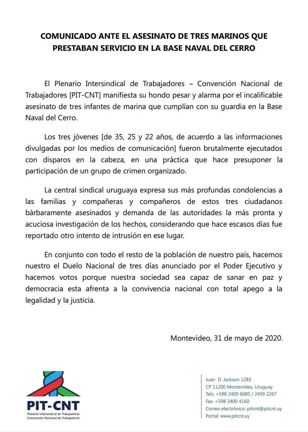 Por su parte, el presidente del Pit-Cnt, Fernando Pereira, escribió en su cuenta de Facbook que le resultaba imposible entender el asesinato de los tres marinos.