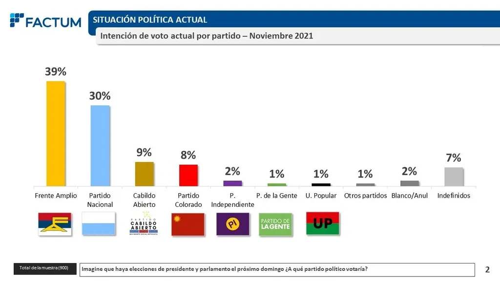 En tanto, si se mira de manera específica entre cada partido, los resultados de la encuesta indican que el 39% votaría al Frente Amplio, 30% al Partido Nacional, 9% a Cabildo Abierto, 8% al Partido Colorado y 2% al Partido Independiente, 1% al Partido de la Gente y 1% a Unidad Popular. El 7% aún estaría indefinido, un 2% votaría en blanco o anulado, y 1% a otros partidos.