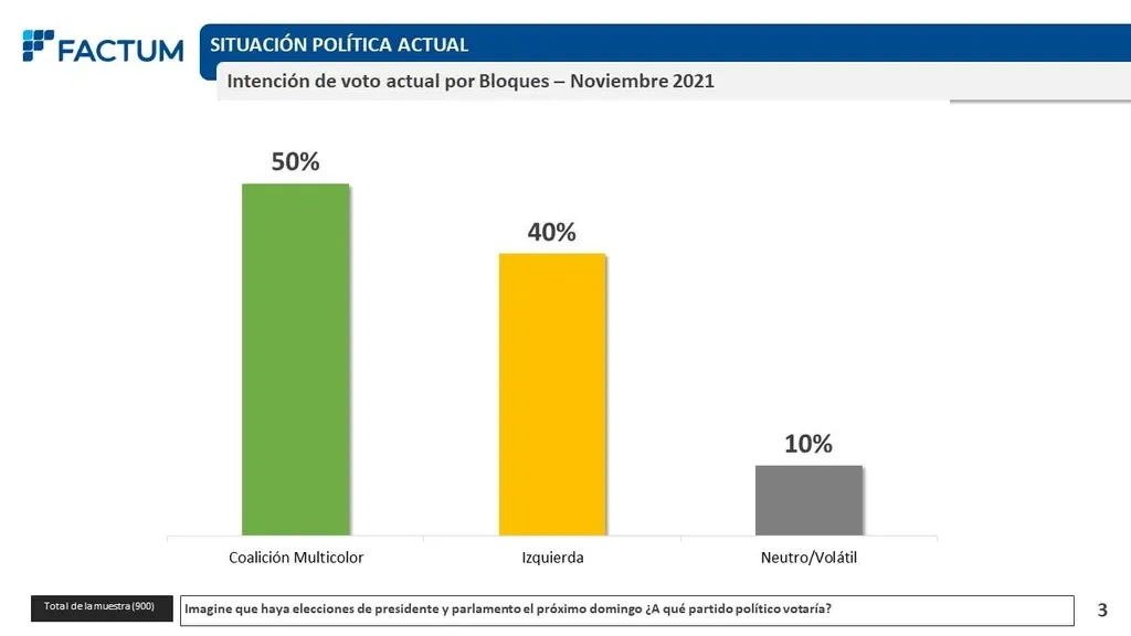 Si las elecciones fueran el próximo domingo, el 50% de los uruguayos votaría a la coalición de gobierno, y el 40% a los partidos de izquierda (Frente Amplio y Unidad Popular), según una nueva encuesta de Factum presentada este martes en VTV Noticias (VTV). En ese caso, el 10% está en una posición neutra o tiene el voto indefinido.