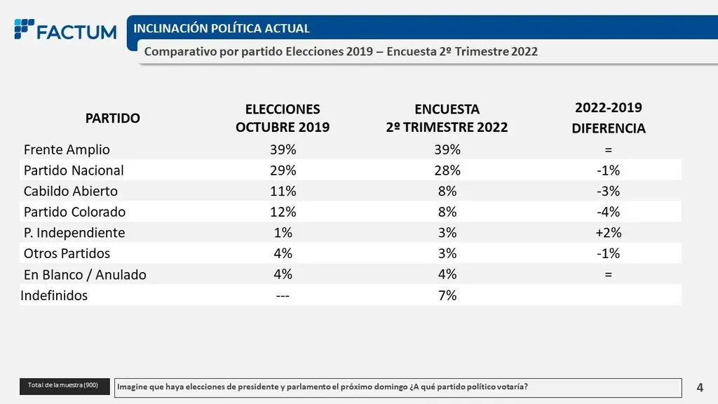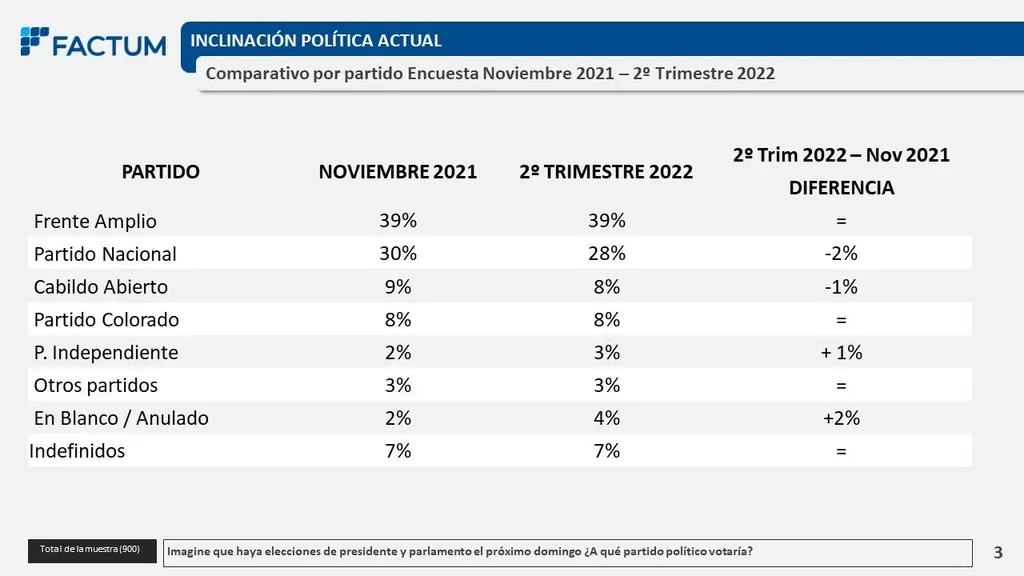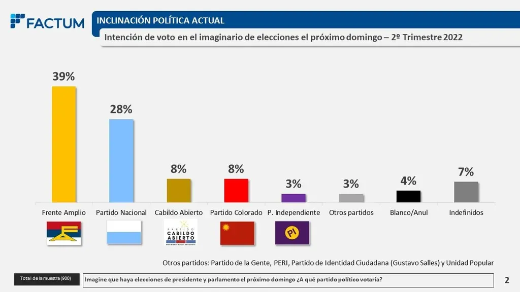 Si las elecciones nacionales fueran este domingo, 39% de los uruguayos votaría al Frente Amplio, 28% al Partido Nacional, 8% al Partido Colorado y otro 8% al partido Cabildo Abierto; 3% se inclinaría por el Partido Independiente y otro 3% por "otros partidos", según una encuesta de intención de voto de Factum, presentada este jueves en VTV Noticias (VTV). Además, un 4% votaría en blanco y el 7% restante no definió su voto.