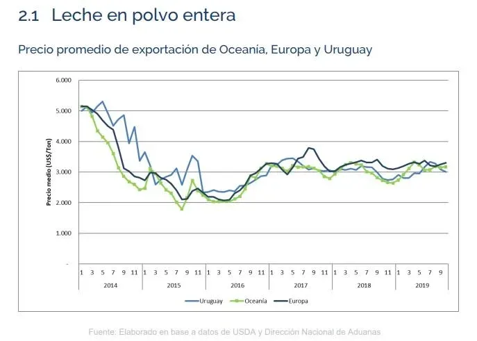 Comparando los 10 primeros meses de 2019 con ese período de 2018, la leche en polvo entera tuvo una caída de 6% en facturación (US$ 325,3 millones) y de 6% en volumen (106.585 toneladas), con un precio promedio de US$ 3.010 por tonelada para los negocios de octubre de este año (9% más que en diciembre de 2018 y 1% más comparando los primeros 10 meses de este año con los primeros 10 de 2018).