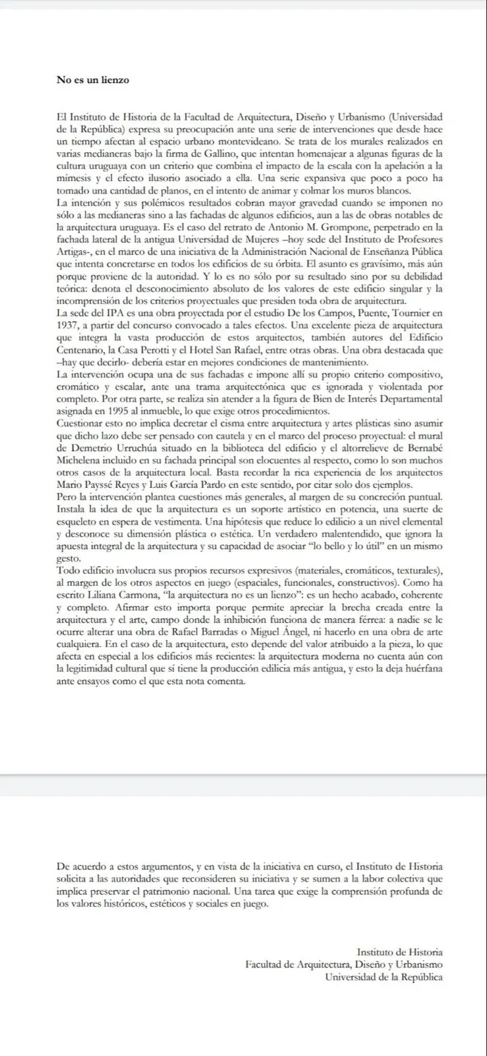 En el comunicado, el Instituto expresa su "preocupación ante una serie de intervenciones que desde hace un tiempo afectan al espacio urbano montevideano", y apunta en particular contra el nuevo proyecto del artista salteño. "La intención y sus polémicos resultados cobran mayor gravedad cuando se imponen no solo a las medianeras sino a las fachadas de algunos edificios, aun a las obras notables de la arquitectura uruguaya".