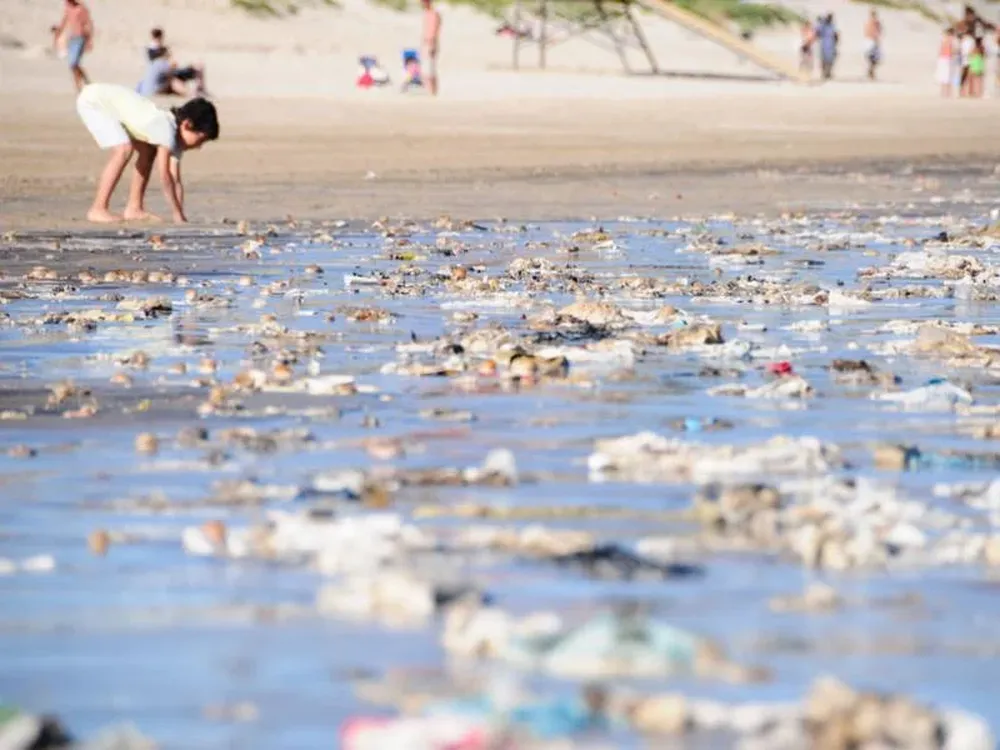 Hace una semana fue en la playa Pocitos, el fin de semana le tocó a la Buceo. Una bandera roja con la palabra “Peligro” escrita en grandes letras blancas se erguía entre un mar de bolsas de nailon, botellas, envases y vasos de plástico, dibujando relieves blancos entre las líneas negras de resaca de la orilla.