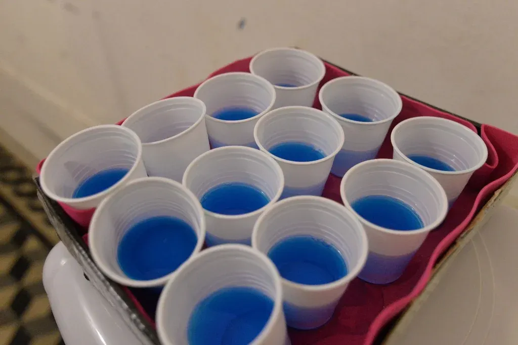 Jabón líquido en vasos descartables para todos los que deseen ducharse.