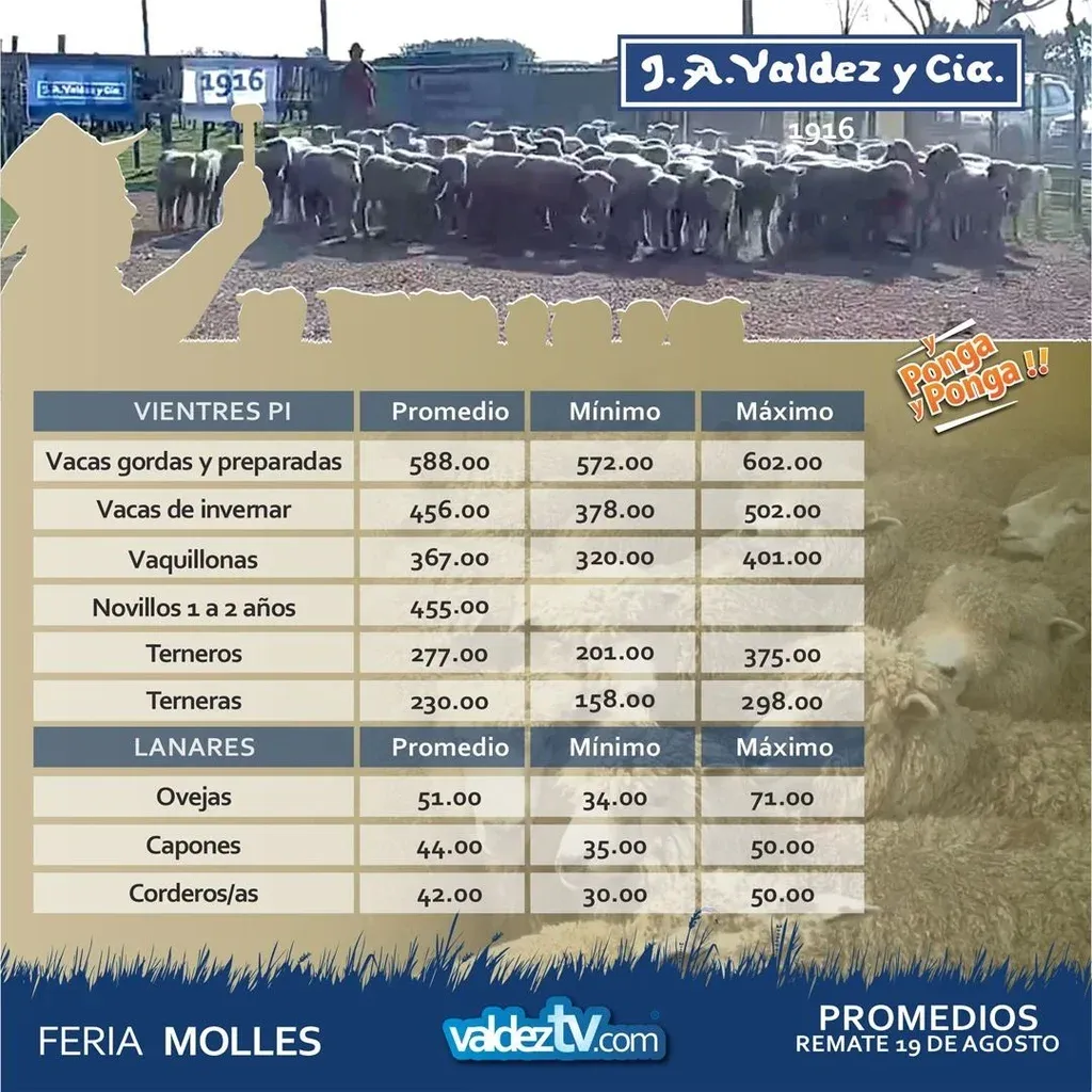 El miércoles 19 de agosto, Valdez y Cía realizó su clásica venta mensual en la Liga de Trabajo de Molles, en Carlos Reyles, Durazno. A pesar de ser una feria de poca oferta, como es típico de la época (se remataron 200 vacunos y 320 lanares), se lograron muy buenos promedios.