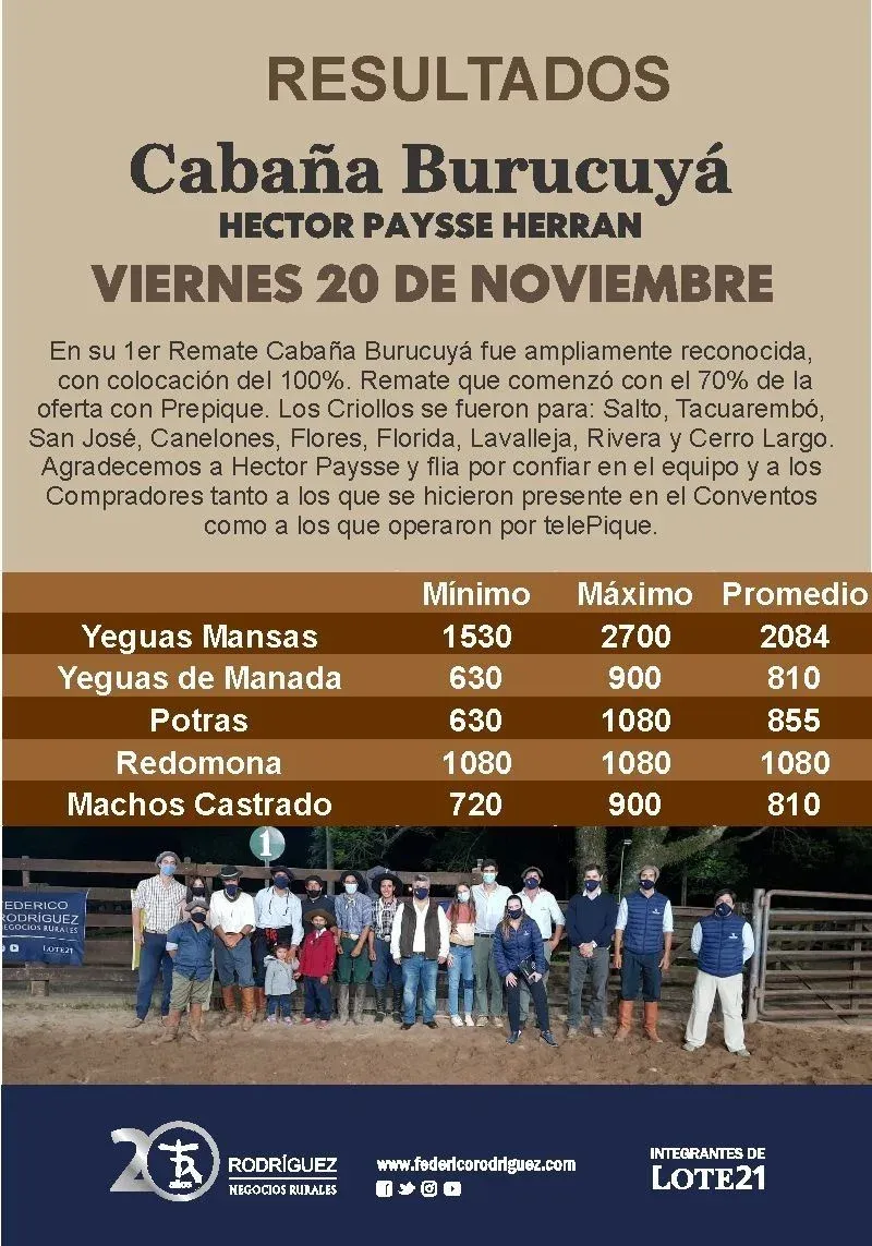 Federico Rodríguez Negocios Rurales agradeció especialmente a Héctor Paysee, director de Cabaña Burucuyá, por la confianza depositada en el escritorio, así como a los compradores que participaron de la subasta en el local Conventos y a aquellos que eligieron operar por Tele Pique.