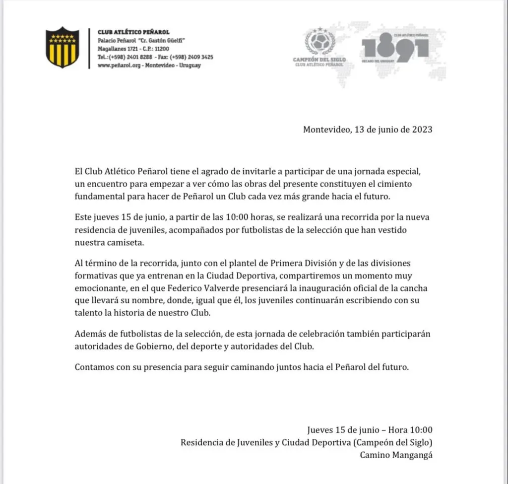 Agrega que "al término de la recorrida, junto con el plantel de Primera división y de las divisiones formativas que ya entrenan en la Ciudad Deportiva, compartiremos un momento muy emocionante, en el que Federico Valverde presenciará la inauguración oficial de la cancha que llevará su nombre, donde, igual que él, los juveniles continuarán escribiendo con su talento la historia de nuestro club".