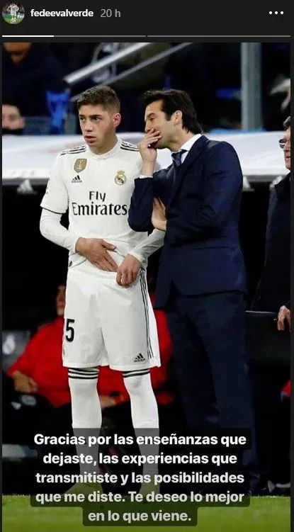 El volante uruguayo de Real Madrid, Federico Valverde, agradeció al ahora exentrenador merengue Santiago Solari, en un mensaje publicado en una historia de Instagram.