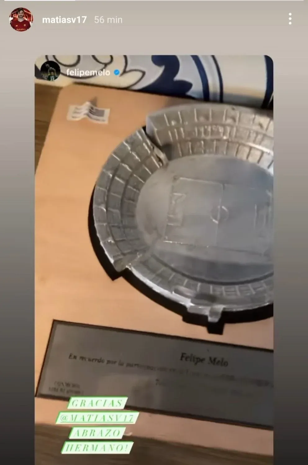 Melo también publicó un video de una réplica del Estadio Centenario que le obsequiaron en Montevideo y aprovechó para agradecerle y enviarle saludos a Matías Viña, quien ahora se encuentra en Roma, pero participó de los dos títulos que obtuvo Palmeiras.