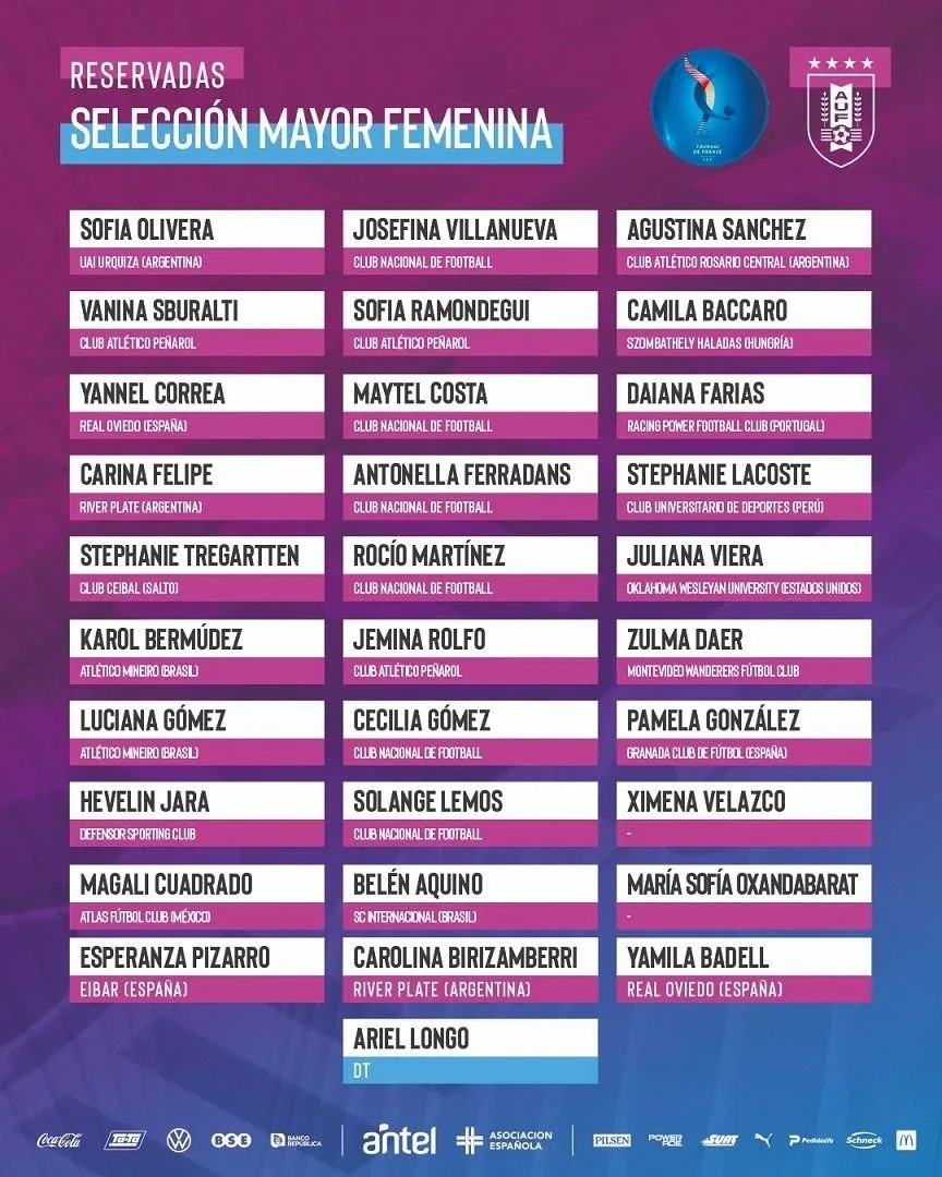El técnico de la selección uruguaya de fútbol femenino, Ariel Longo, reservó a 30 futbolistas para la próxima fecha FIFA, en la que las celestes jugarán un torneo en Angers y Laval en Francia, entre el 15 y 21 de febrero.