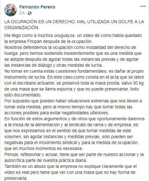 Después de que un grupo de 38 trabajadores sindicalizados de Friopan ocuparan la empresa durante cuatro días a partir del viernes 24 de mayo, y dejaran en malas condiciones la planta en donde se procesa masa, el presidente del PIT-CNT, Fernando Pereira, escribió un post en su cuenta de Facebook que tituló: “La ocupación es un derecho, mal utilizada un golpe a la organización”.