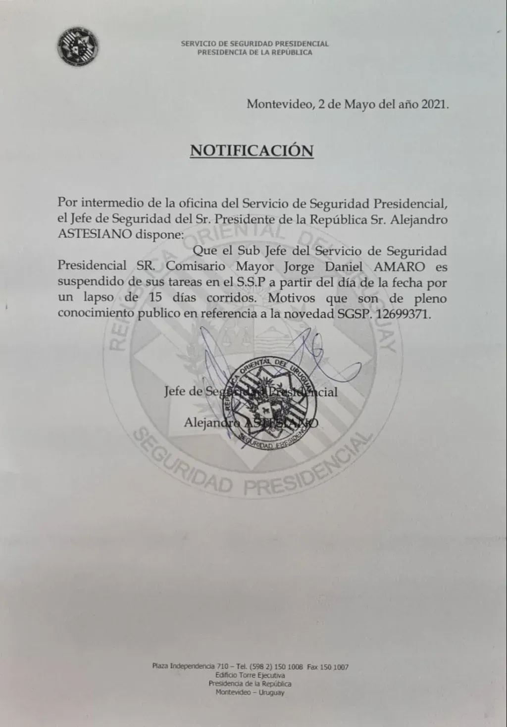 Incluso, Sánchez presentó otro documento –una notificación de suspensión a un integrante de la seguridad presidencial- donde Astesiano firma, con sello incluido, como jefe de seguridad presidencial.