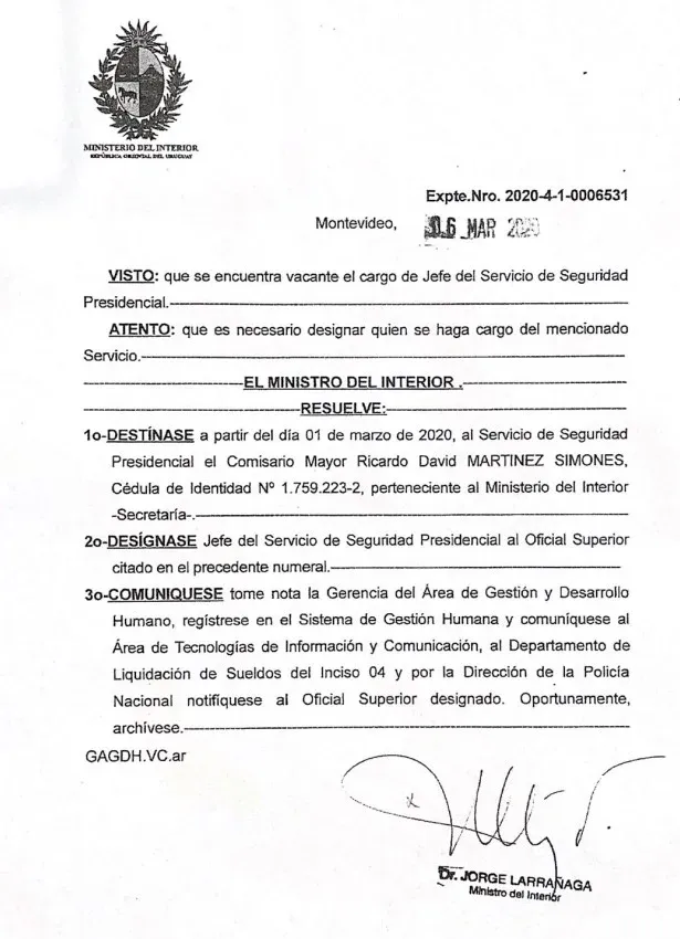 Desde Presidencia, en tanto, respondieron con la resolución por la que Ferrés designó al comisario mayor Ricardo Martínez como jefe del Servicio de Seguridad Presidencial desde el 1° de marzo.