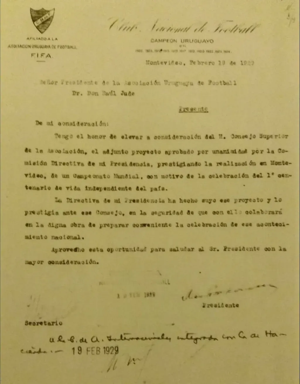 La carta de Nacional enviada a la AUF con la idea de sus dirigentes de que se realizara la primera Copa del Mundo en 1930 en Uruguay