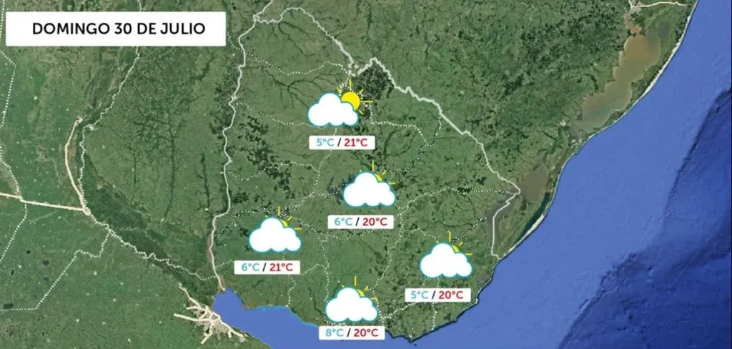 Inumet El pronostico para el domingo 30 de julio Para el domingo 30 de julio la temperatura en el sur estará entre 8°C y 20°C, en el este entre 5°C y 20°C, para el centro entre 6°C y 20°C, para el norte entre 5°C y 21°C y para el oeste entre 6°C y 21°C. "Nos espera una día algo nuboso con temperatura muy agradables", apuntó la meteoróloga sobre el domingo.
