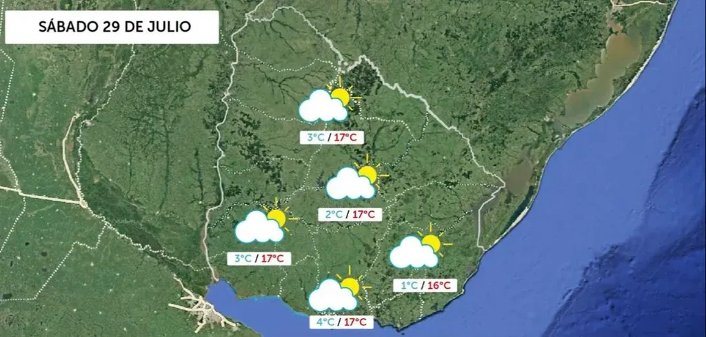 Inumet El pronostico para el sábado 29 de julio Para el sábado 29 también se prevé que esté semi nublado en todo el país. Para el sur se prevén temperaturas entre 4°C y 17°C, para el este entre 1°C y 16°C, para el centro entre 2°C y 17°C, para el norte entre 3°C y 17°C y para el oeste entre 3°C y 17°C. "También se puede generar heladas en la madrugada del viernes y en la madrugada del sábado", comentó Chipponelli.