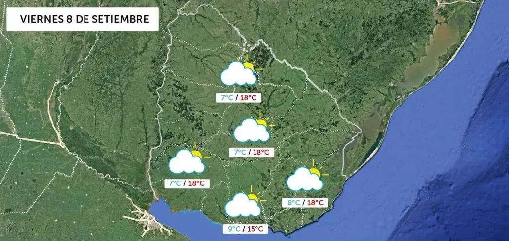 Captura Inumet El pronostico de Inumet para el viernes 8 de setiembre En el sur las temperaturas serán de 9°C a 15°C en el sur, de 8°C a 18°C en el este, de 7°C a 18°C en el centro, de 7°C a 18°C en el norte y de 7°C a 8°C en el oeste.