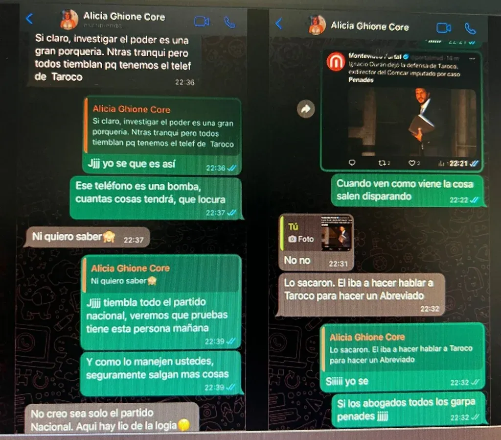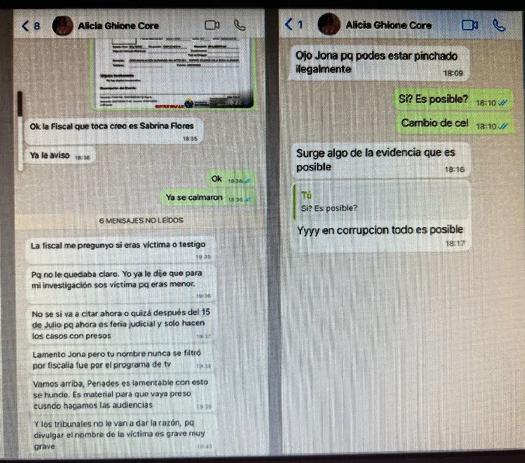 En otra conversación, Ghione se comunicó con "Jona" y le dijo: "Ojo Jona pq (sic) podés estar pinchado ilegalmente". Luego de que la víctima le preguntara si eso era "posible" y asegurarle que iba a cambiar de celular, la fiscal le respondió que "surge algo de la evidencia que es posible" y reafirmó que "en corrupción todo es posible".