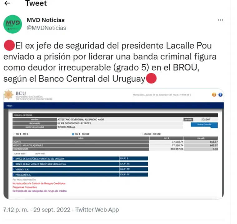 Según informó MVD Noticas, Astesiano también figura como deudor grado 5, que significa irrecuperable del Banco República, según la clasificación que hace el Banco Central.