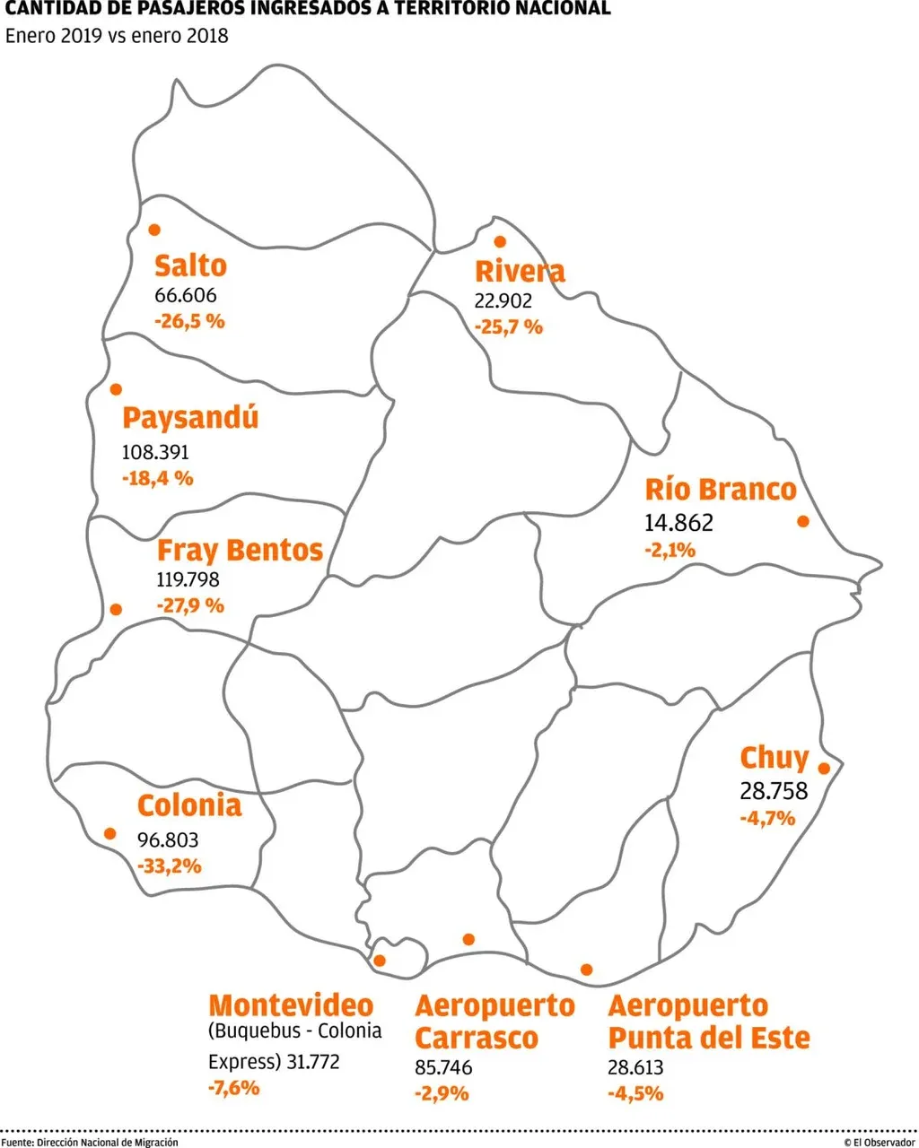 La cantidad de brasileños que arribaron al país fue apenas 1% menos. En enero ingresaron 57.326. Casi 18 mil entraron por el Aeropuerto de Carrasco y la terminal aérea de Punta del Este.