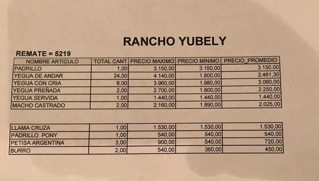 El precio máximo fue para la categoría yeguas de andar y fue de US$ 4.140. Los 24 productos comercializados hicieron un promedio de US$ 2.461.