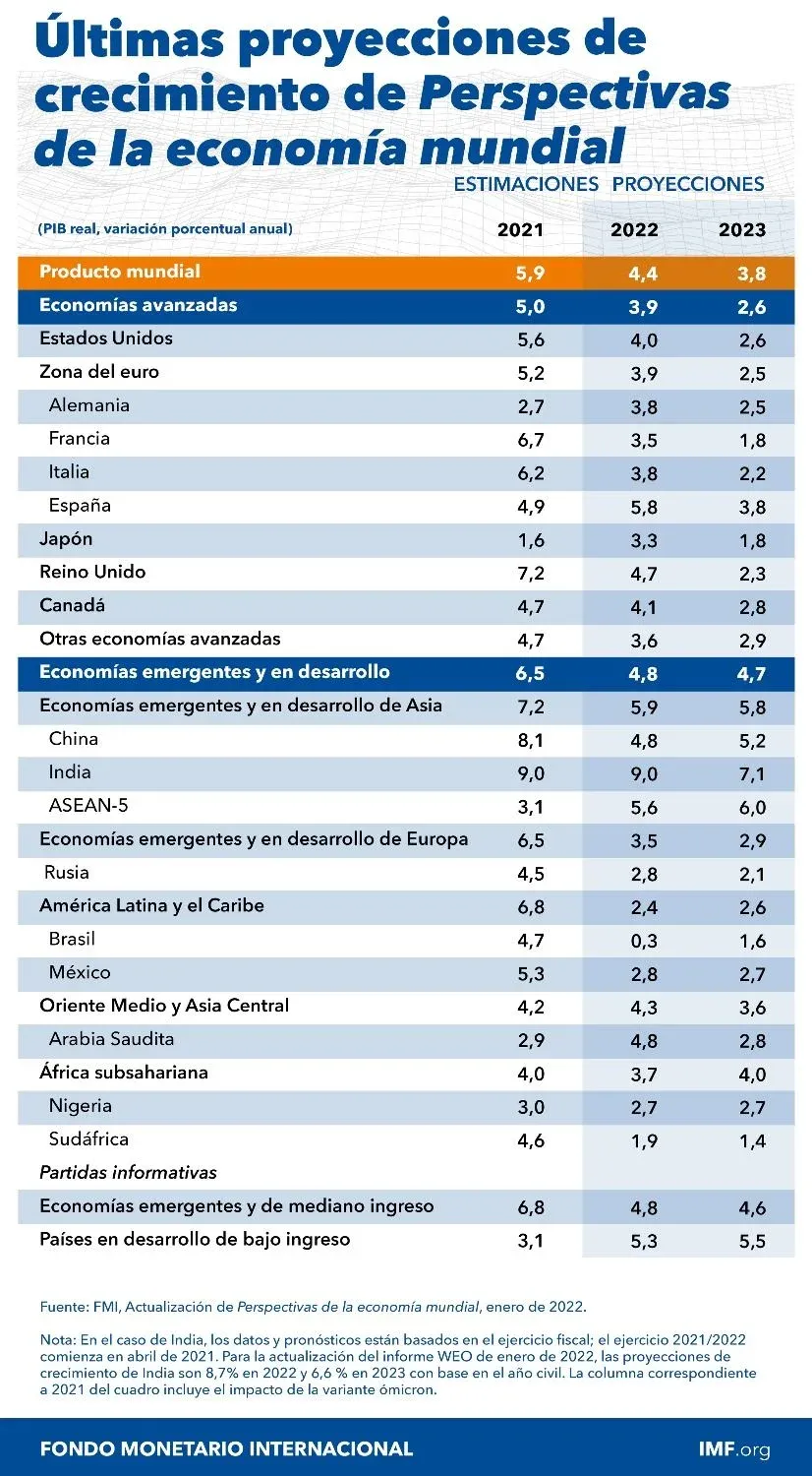 En tanto, para Argentina, tercera economía de Latinoamérica y que negocia desde hace meses la refinanciación de una deuda de US$ 44.000 millones con el FMI, el Fondo prevé un crecimiento de 3% en 2022, luego de una contracción del 9,9% en 2020 y una expansión del 10% en 2021.