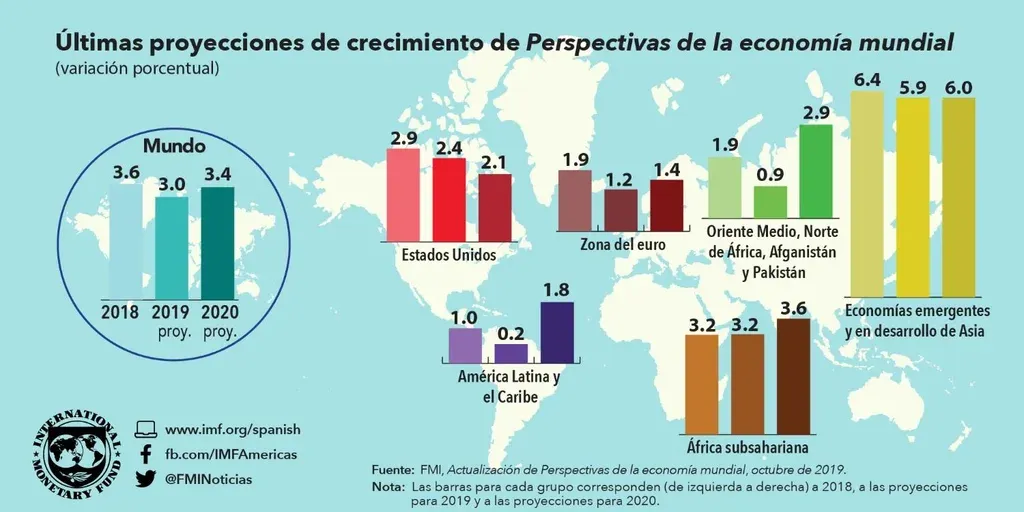 En el 2020, el Fondo dijo que el crecimiento mundial repuntaría a 3,4%, ante las expectativas de una mejoría en la actividad de grandes economías emergentes como Brasil, México, Rusia y Arabia Saudita. Pero la proyección es 0,1 puntos porcentuales menor a la estimación de julio y aún presenta riesgos bajistas por las tensiones comerciales y el impacto imprevisible del Brexit.