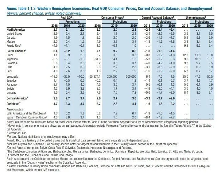 En el caso de Uruguay, el organismo espera una expansión modesta (0,4%) del PIB para este año, pero prevé una aceleración de la actividad para 2020 con una proyección de 2,3% de crecimiento de la economía. La inflación cerraría el 2019 con un promedio de 7,6%, para luego caer cuatro décimas el año próximo (7,2%). Sobre el mercado laboral, el FMI proyecta una leve mejora de la tasa de desempleo que pasaría del 8,6% de este año a 8,1% en 2020.
