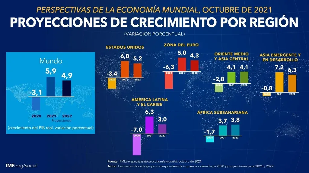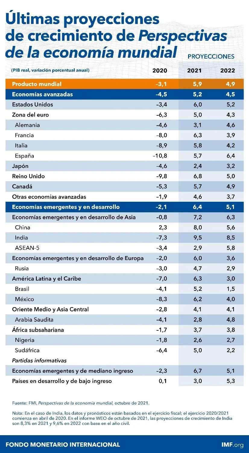 En ese contexto, el organismo proyecta que la economía mundial crezca 5,9% en 2021 y 4,9% en 2022 (0,1 puntos porcentuales menos que lo previsto en julio de este año), según el informe de Perspectivas de la economía mundial.