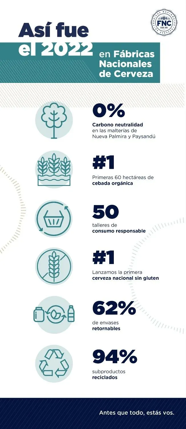 La compañía opera dos malterías, dos cervecerías y una planta de elaboración de refrescos que cuentan con sus propias plantas de tratamiento de efluentes y en 2022 alcanzó la neutralidad de carbono en sus malterías de Nueva Palmira y Paysandú.