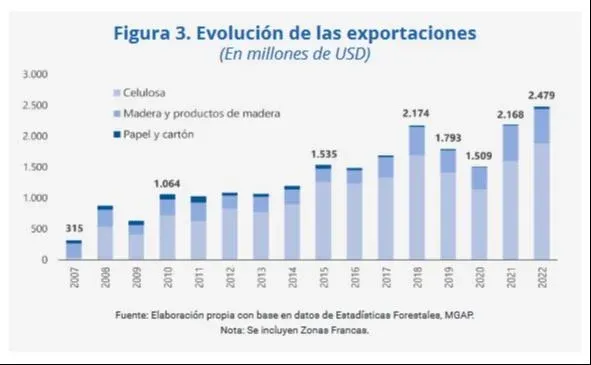 Las exportaciones totales del sector forestal podrían incrementarse alrededor de 34% este año, lo que las situaría en un monto cercano a US$ 3.237 millones al cierre de 2024, un récord. Ese dato es una de las consideraciones del análisis “Evolución reciente y perspectivas del comercio exterior de productos forestales de Uruguay”, que integra el conjunto de estudios comprendidos en el Anuario 2023 de la Oficina de Programación y Política Agropecuaria (Opypa) del MGAP.