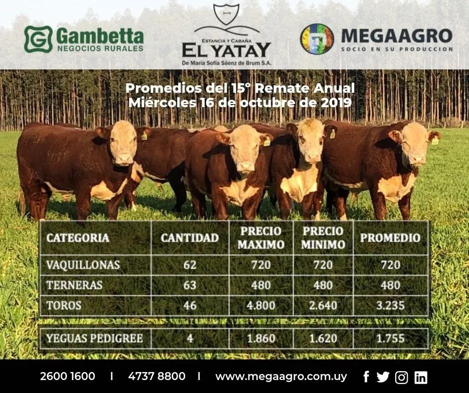 En lo que fue una venta ágil y dinámica, se liquidaron prácticamente todos los toros Polled Hereford de la estancia y cabaña El Yatay, de la firma María Sofía Sáenz de Brum SA, que hicieron un precio promedio de US$ 3.235.