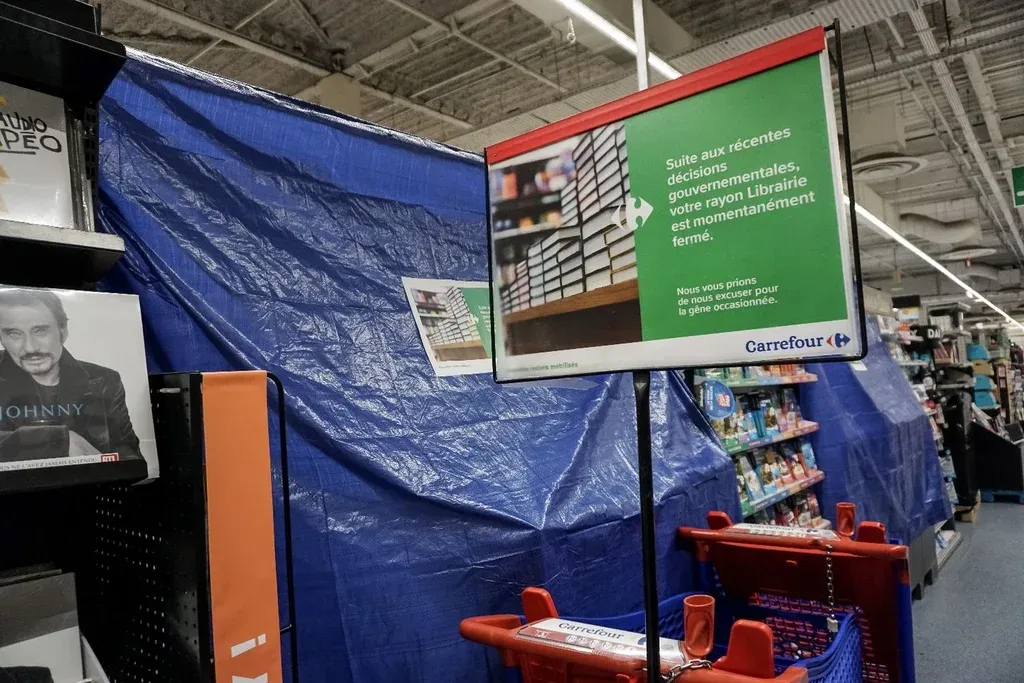 En los supermercados de toda Francia, las estanterías, normalmente llenas de novelas y otros libros están vacías o tapadas, una decisión que busca acallar el enojo de las librerías cerradas por el nuevo confinamiento.