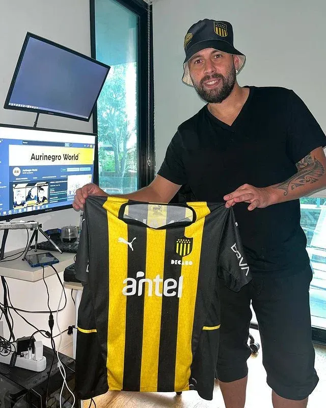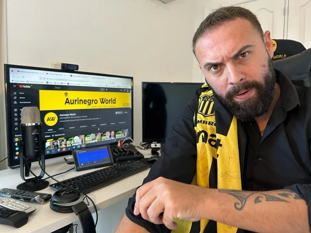Freddy García y la camiseta de Peñarol, con su canal Aurinegro World en la pantalla de la computadora
