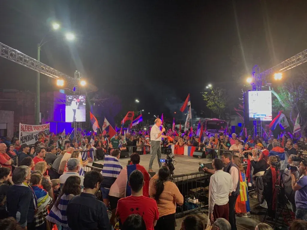 Daniel Martínez camina sobre el cuadrilátero ante la atenta mirada del público. No lleva guantes ni tiene quien le haga de sparring, pero cualquiera de los presentes puede imaginar al nacionalista Luis Lacalle Pou arriba del ring. Cada crítica al candidato opositor es celebrada con un alarido, con un grito de gol, con aplausos.