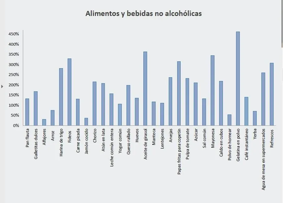 En esta lista hay distintos productos de la canasta básica como pan, arroz, harina, fideos, carne picada, aceite, huevos, azúcar, leche, pulpa de tomate, yerba y refrescos, entre otros.