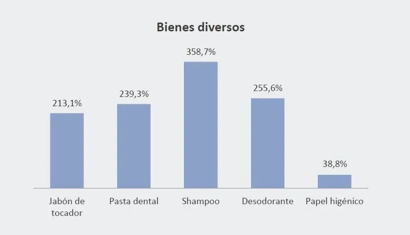Esta división presenta una significativa diferencia de precios en la mayoría de los artículos relevados que alcanzan el 123%. Las diferencias de precios son 358,7% para shampoo, 239,3% en pasta dental, 213,1% en jabón de tocador, 255,6% en desodorante y 38,8% en papel higiénico.