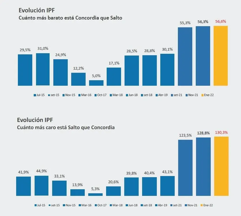 El Observatorio Económico de la Universidad Católica de Salto (IPF) publicó este miércoles el Indicador de Precios Fronterizos actualizado a enero. La medición mostró que la brecha de precios entre esa ciudad y Concordia en Argentina sigue creciendo.