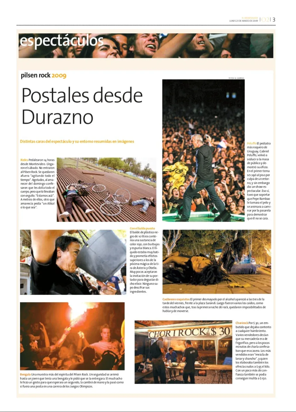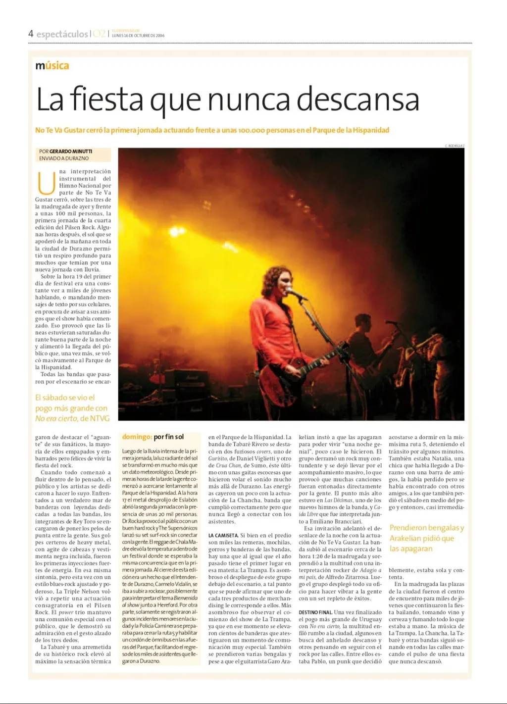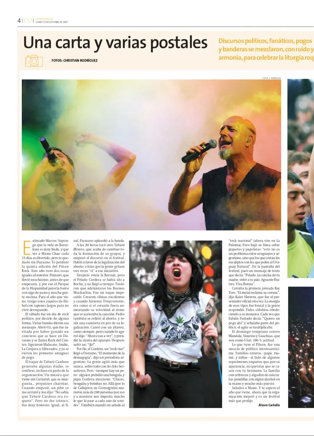 «Por fin, (Gustavo) Cordera, un “rock star” llegó a Durazno. “El momento de la demagogia”, dijo un periodista argentino. La gente agitó más que nunca, sobre todo con los hits bersuiteros. Pero –siempre hay un pero– alguien prendió una bengala, y papá Cordera aleccionó: “Chicos, bengalas y bombas no. Allá (por lo de Callejeros en Cromagnón) murieron más de 200 personas por eso y a nosotros nos importa mucho lo que le pase a cada uno de ustedes”. También mandó un saludo al “rock nacional” (ahora vive en La Paloma). Pero bajó su línea sobre piquetes y papeleras: “esto no es un problema entre uruguayos y argentinos, sino que los que cortan los eucaliptos son los que joden al Uruguay Natural”. En la pantalla del festival, pasó un mensaje de texto que decía: “Pelado, la concha de tu madre, volvé a tu país. Aguante Buitres. Viva Botnia”.»