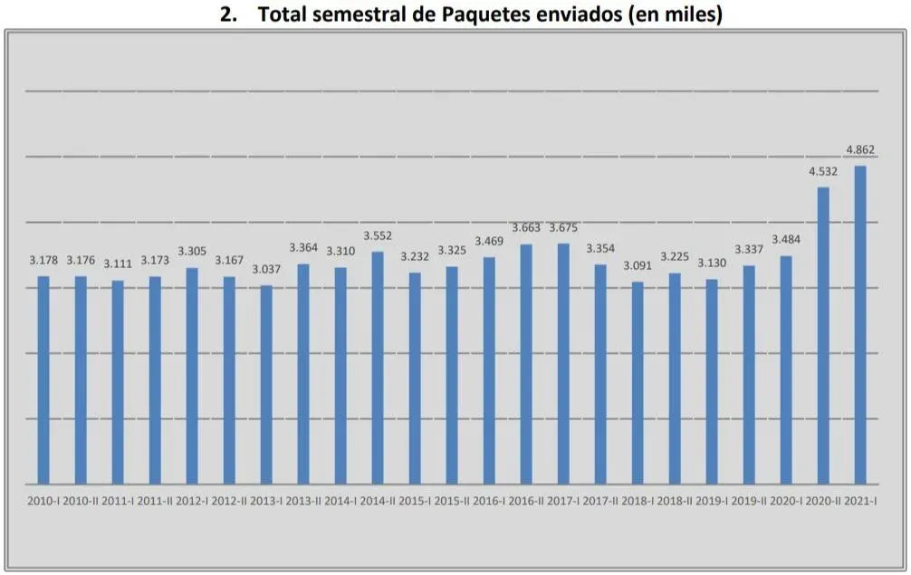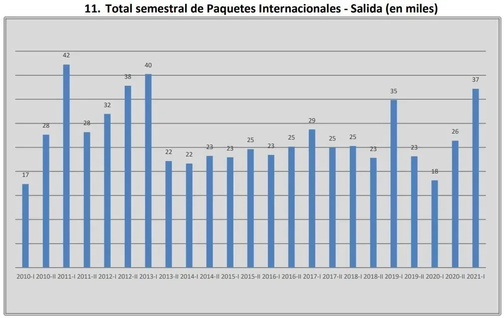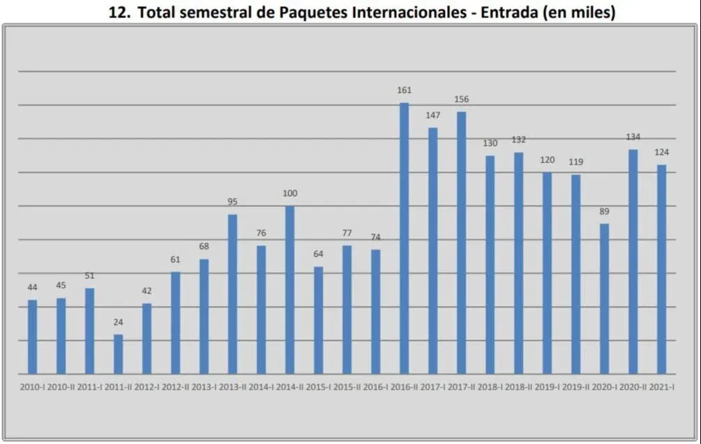 En lo que refiere a entrada, se recibieron del exterior 124 mil paquetes, unos 10 mil por debajo del segundo semestre de 2020 pero 4 mil por encima del primer semestre de 2019.