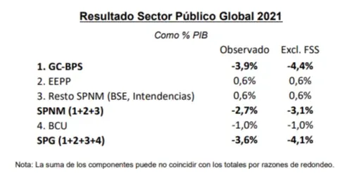 De acuerdo al comunicado oficial, en 2021 el resultado del Gobierno Central - Banco de Previsión Social (GC-BPS) se ubicó en -3,9% del PIB. El ingreso de fondos al Fideicomiso de la Seguridad Social (FSS) —ley de los cincuentones— fue de 0,5% del PIB, por lo que el resultado fiscal del GC-BPS depurado de este efecto fue de -4,4% del PIB.