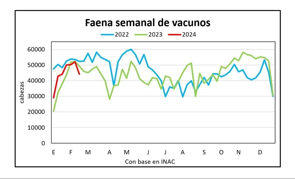 Blasina y Asociados La semana pasada, con menor operativa por los feriados de Carnaval y menguado volumen de corral en la última etapa de cuota, la faena quedó muy por debajo de las 50.000 cabezas, con 44.270 vacunos.