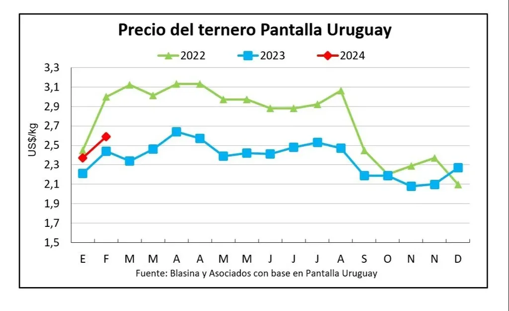 En la reposición no aparece un volumen importante de oferta. Hay demanda y precios firmes, como se vio esta semana en el remate de Pantalla Uruguay, con categorías que subieron entre 5% y 10%. Los terneros promediaron US$ 2,59, un 9% arriba del promedio de enero.