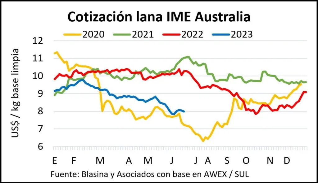 El Indicador de Mercados del Este (IME) perdió el 1% en dólares y cerró a US$ 7,99 mientras que en moneda local la caída fue de 2,8% para cerrar a AU$ 11,74 por kilo base limpia. En las últimas dos semanas, aumento de tasas bancarias mediante, el dólar australiano ganó 5% frente al dólar al tiempo que el indicador lanero bajó 3%.